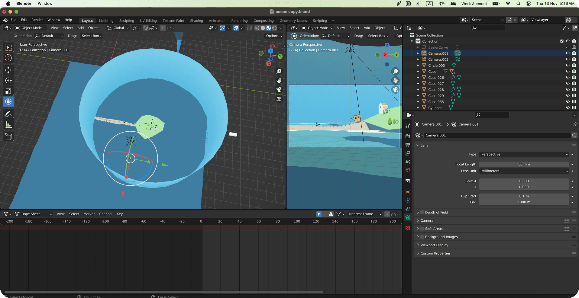 From there, I tried to branch out, creating scenes with Emission materials for that low-poly, cel-shaded look. One of my inspirations was the Lüttmoorsiel-Nordstrandischmoor Loren island railway in Germany, which I'd love to ride someday. This eventually became the ocean railway, a little trolley animation that experimented with different camera angles.