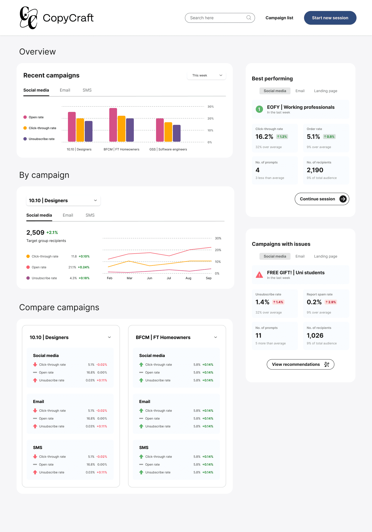 These dashboards first provide an overview of information, and then narrow down, allowing the user to compare performance of specific campaigns across platforms.