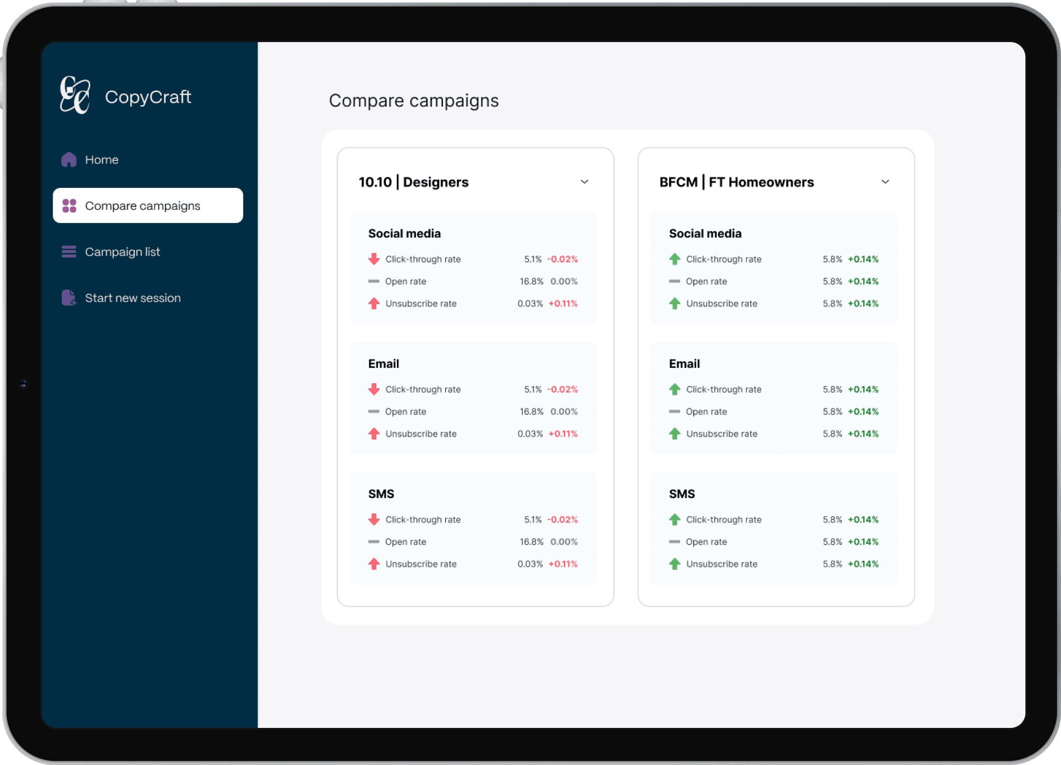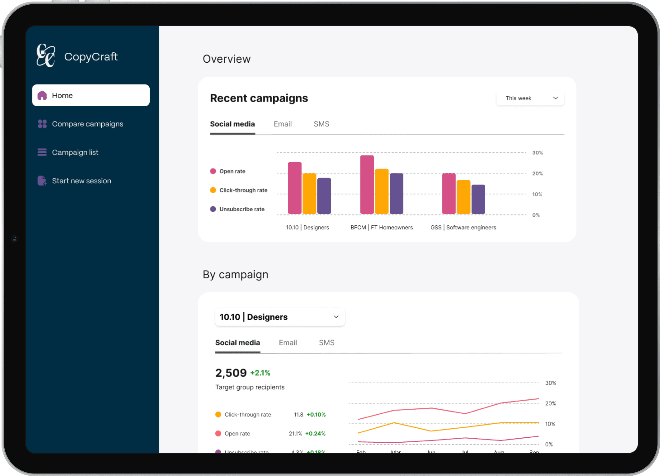 With a tablet view, campaign analytics are within easy reach, without disrupting the writer’s workflow.